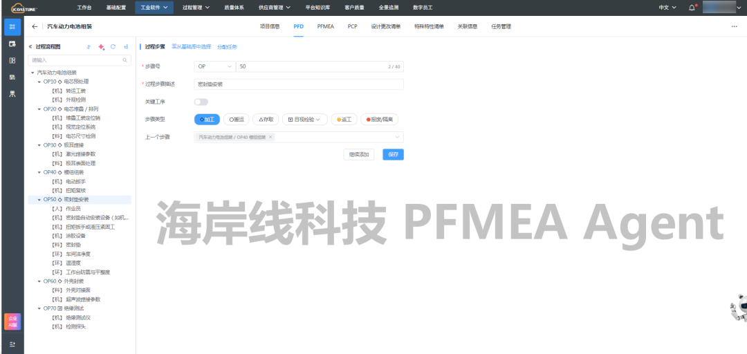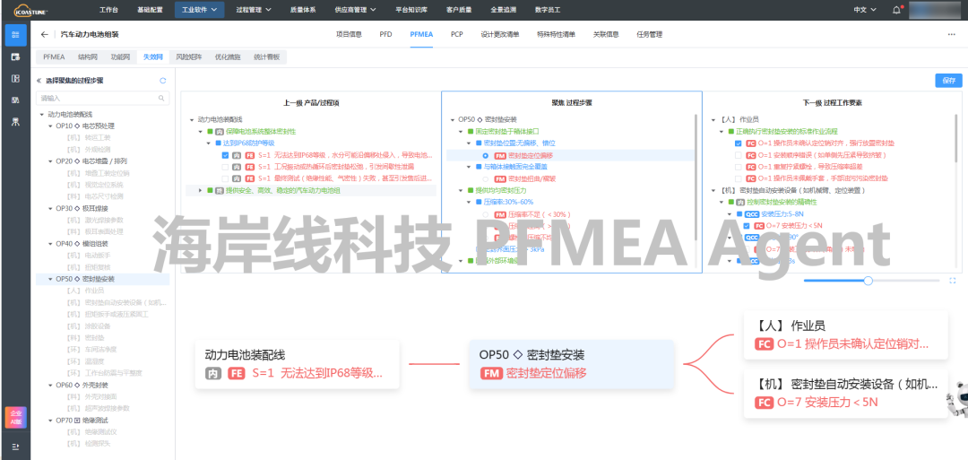 PFMEA的精髓不在于创建一份完美的报告,而于培育一种“预防优于纠正”的质量文化。但在实践中,其繁重的分析工作、庞杂的数据整合以及对工程师经验的高度依赖,往往让企业力不从心。正因如此,海岸线科技打造了PFMEA Agent,通过人工智能技术,为企业提供一位不知疲倦、知识渊博的“数字工程师”,与传统工程师形成能力互补,将PFMEA从一项繁重的“文档任务”转变为高效的“智能分析”。