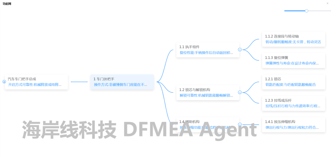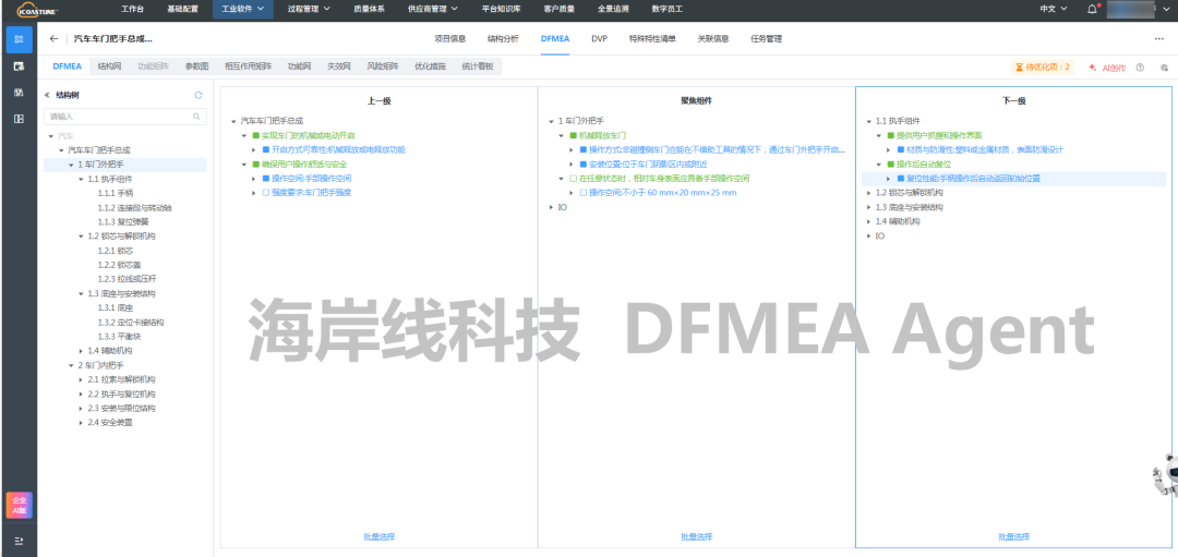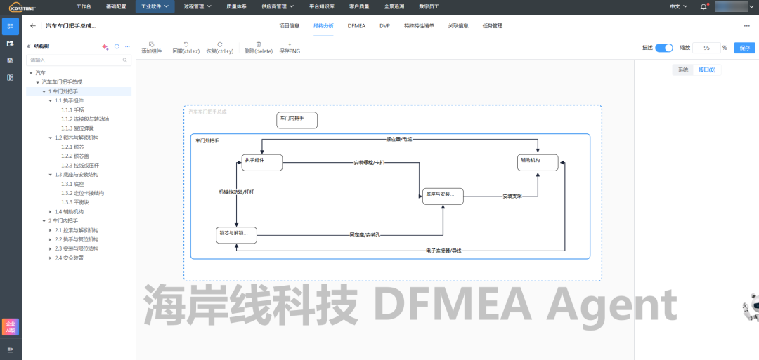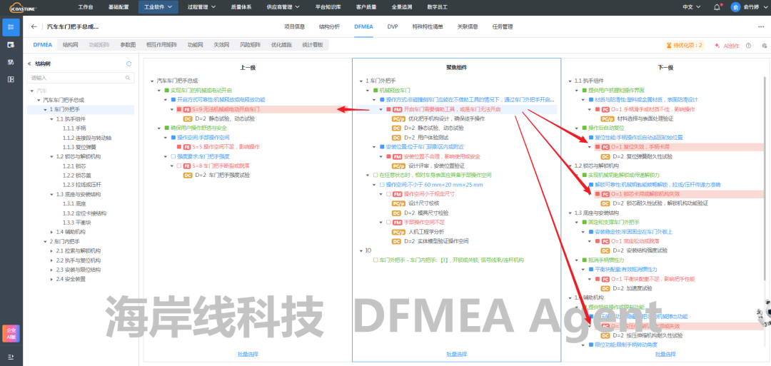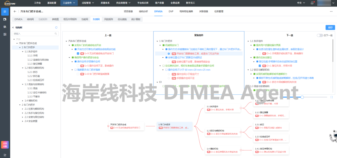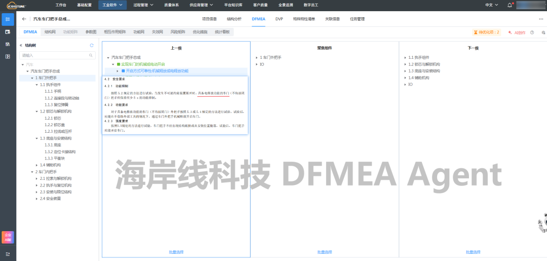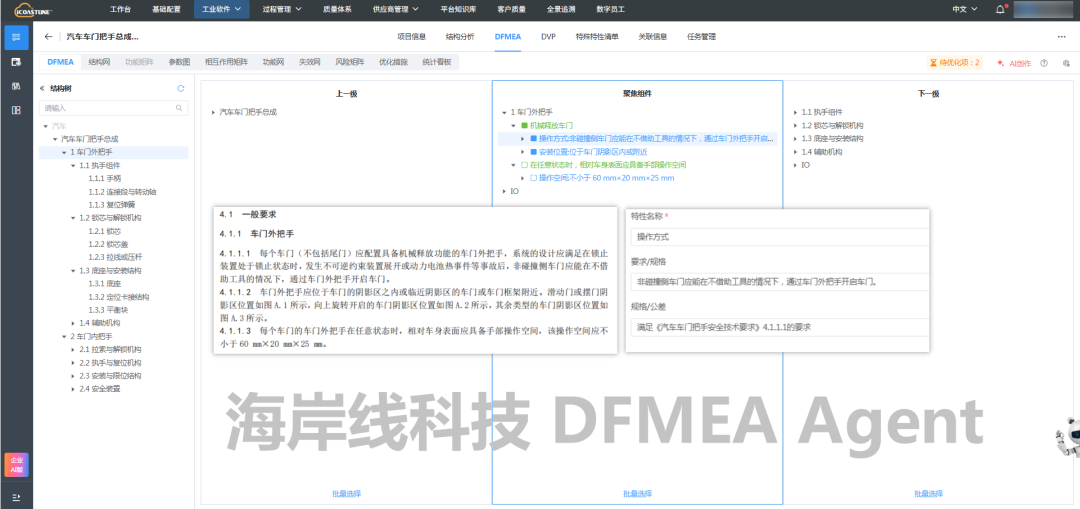 DFMEA Agent将技术要求中关于车门外把手的要求,转化为DFMEA分析中的功能要求,并且在海岸线科技的AQP FMEA软件中,可以看到Agent分析的参考来源,便于工程师检查和确认。