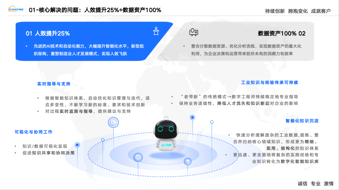 数字工程师能够整合企业分散的数据资源,包括产品设计经验、质量管理经验、工艺资料等私域知识,以及行业标准、最佳实践等广域知识,实现数据资产100%的充分利用。