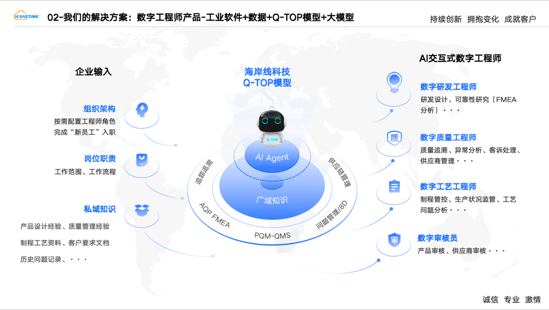 海岸线科技的数字工程师是“知识驱动+场景适配”的智能化工具,通过整合数据资产、沉淀专业知识、辅助多角色协作,系统性解决了制造业人效提升、数据利用、知识传承及多业务场景效率的核心挑战,是企业向新质生产力转型的关键技术支撑。