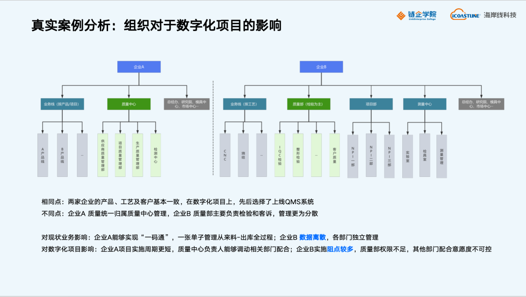 企业A,质量中心因长期统筹全链质量,已形成“全局视角”的工作习惯,员工更易接受数字化带来的流程变革;