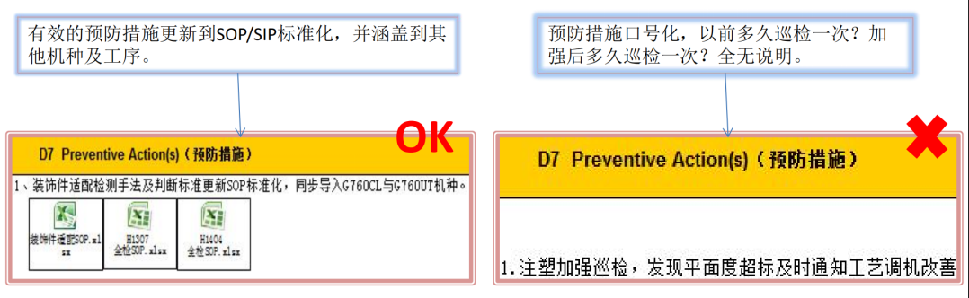 D7预防措施:有效的方案需标劌采准化到SOP/SIP等文件中,共享到其他制程,不能口号化;