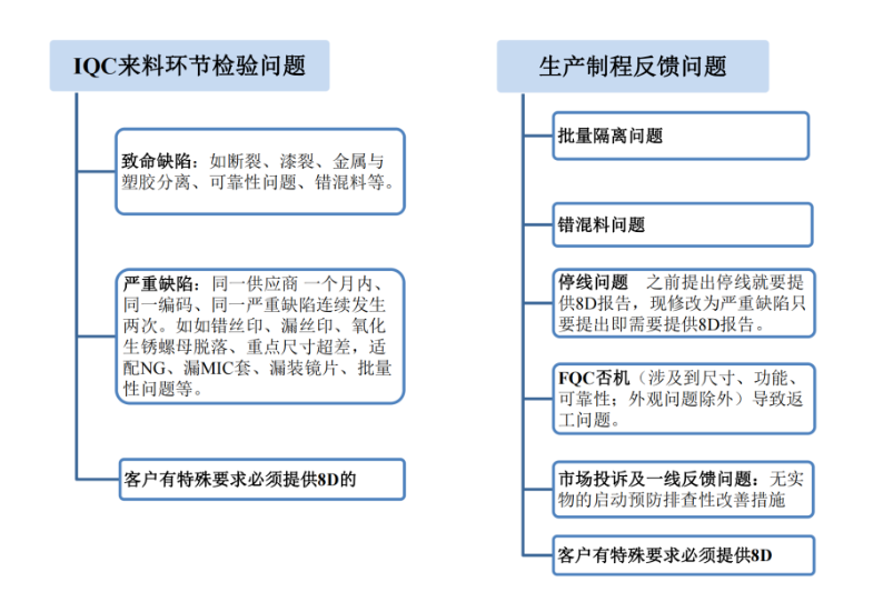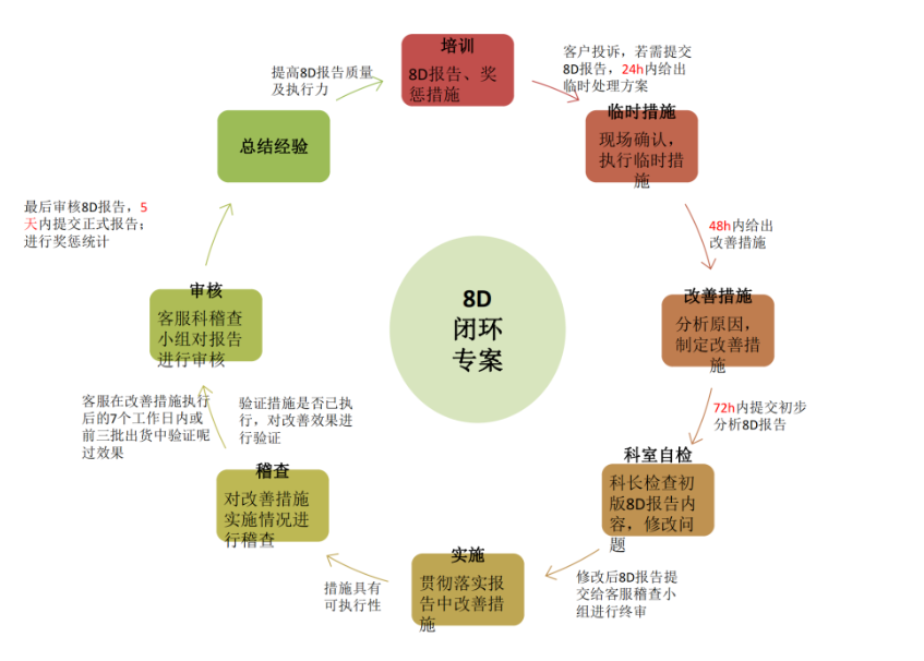 1、2458准则:24h内给出临时处理方案;48h内给出改善措施;5天内给出正式8D报告;