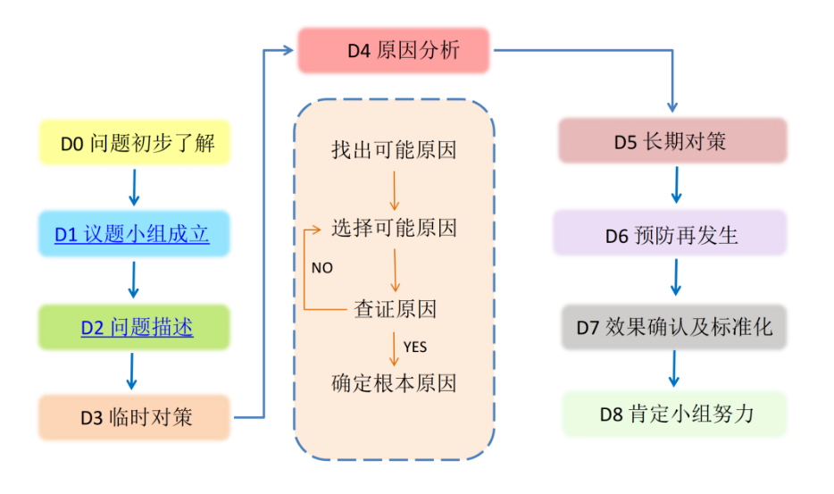 随着实践的深入,8D从最初的八个步骤扩展至九个(包括D0:问题初步了解),以更加全面地覆盖问题解决的全过程: