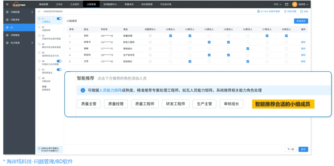 通过海岸线科技的8D工具,可以借助人员能力矩阵,智能推荐合适的小组成员,科学分析,深挖问题更多潜在根因。