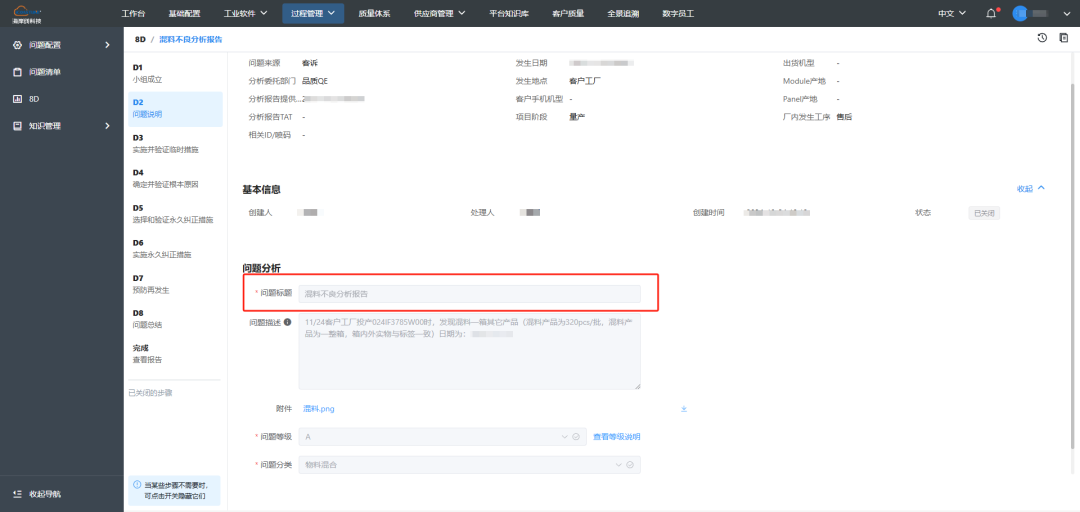 以上是小编试用海岸线科技问题管理/8D软件试写的【客诉混料不良分析报告】,如需更详细的案例可以联系我们申请试用,帮助你更系统完善地做好8D。
